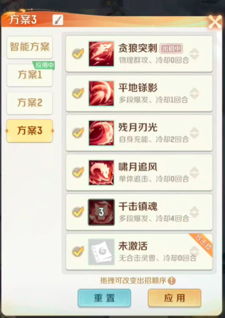 目前小编比较推荐的方案是贪狼突刺,平地铩影,残月刃刀,啸月追风,千击镇魂,这是人宠都可以使用的技能顺序设置,尤其是在特定挂机状态下可以选择。而玩家如果使用的是龙马作为宠物,那么可以把龙马的合体技能拖到第二回合,这个合体技能就是万马奔腾,合击群攻冷却三回合。