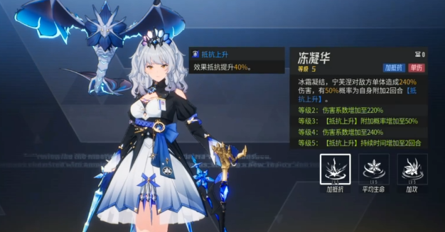 宁芙涅的技能包含普通攻击、群体回复与大招三类,不同技能的定位与使用场景存在明确差异,普通攻击名为冻凝华,以冰霜元素为基础,对敌方单体造成伤害的同时,有概率为自身附加抵抗上升状态,该状态可持续数回合,从技能优先级来看,副本对战场景中由于普通攻击伤害有限,且并非团队核心需求,通常无需投入技能点,而在竞技对战中当技能等级提升至特定阶段后,可解锁速度提升效果,对于需要争夺出手顺序的竞技环境,该效果能帮助宁芙涅更早施加团队增益,此时可根据技能点储备酌情提升等级。