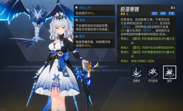 群体回复技能溢流霜的机制较为特殊,释放后会先将友方全体的生命百分比拉平,再进行全体治疗,治疗量与目标的生命上限相关联,这一技能在副本与竞技场景中均非必点选项,副本中队伍续航可通过其他更高效的手段实现,竞技中则需结合整体战斗节奏与技能点分配情况判断,若团队已有稳定续航来源,可优先将资源投入其他核心技能,大招极凛寒魄是宁芙涅的核心技能,具备多重团队增益效果,释放后可为友方全体附加攻击上升状态持续两回合,同时赋予全体一回合免疫效果,抵御控制类技能影响,还会为队友附加基于宁芙涅自身最大生命一定比例的特殊护盾,该护盾持续两回合,且对主目标的所有增益效果持续时间会额外延长一回合,这一技能各种模式的玩法中都具有极高的优先级,推荐优先点满以最大化增益效果。