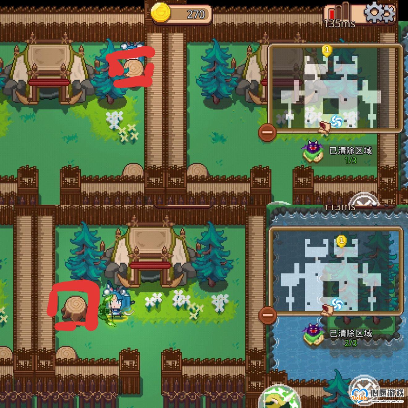 到图中位置等会会刷出树桩子,打烂后,下面的门就开了,如果没有树桩子等了一会还没有,那就去别的区域溜达溜达,然后回来就差不多了
