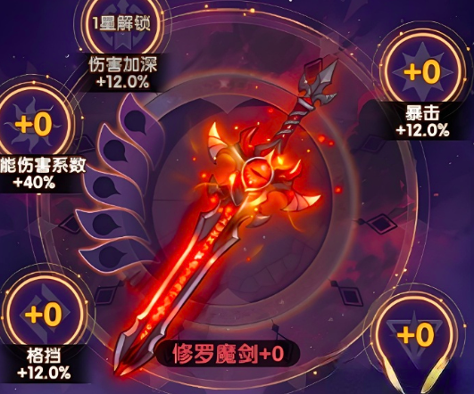 第一个圣物修罗魔剑,这个圣物自带5个槽位,分别可以从伤害、魔法格挡、暴击、抗暴击和技能加持这5个方面进行提升,玩家除了可解锁这些重要加成外,这件装备还可获得20%的技能伤害增益,释放技能效果后还可以获得额外增伤,对于输出或暴击流的团队来看是必带圣物,能够让整个团队的属性效果都有着不错的提升。
