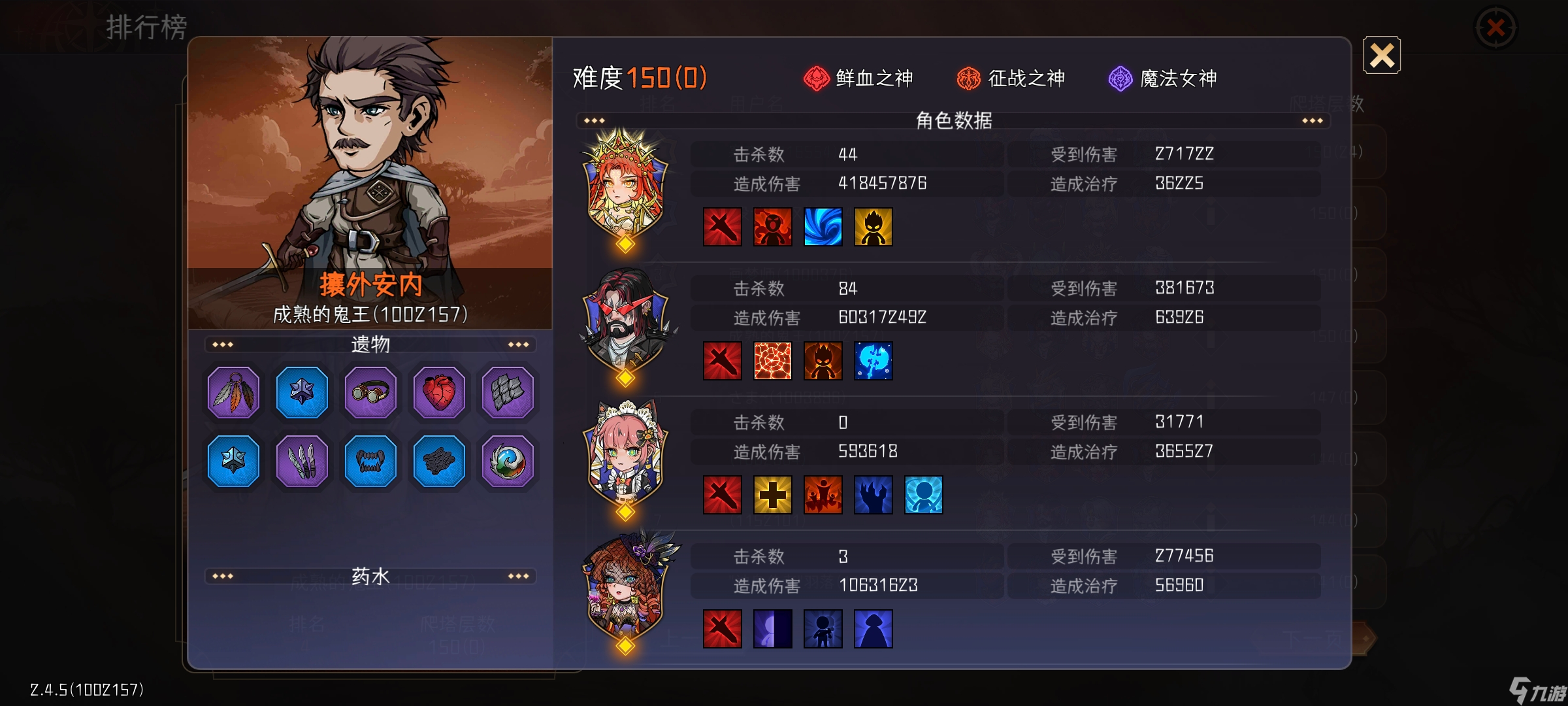 接下来,147乱杀黑星,靠护盾打过150起义军首领,靠西芙项链硬币护卫神艰难砍过150狼王。这三局虽然前期挂机的时间久了点外,但除打boss外,全靠挂机,还算稳定。(一个商店不敢抢)