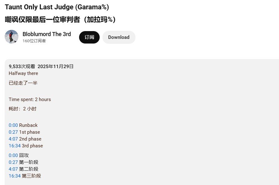 油管频道主Bloblumordthe3rd将这项实验性挑战命名为“Garama%”,并每周更新挑战进度视频。由于“嘶吼”造成的伤害极低,每一场Boss战都变得异常漫长。例如,击败第一幕的最终Boss就耗费了他近两个小时不间断的尝试。