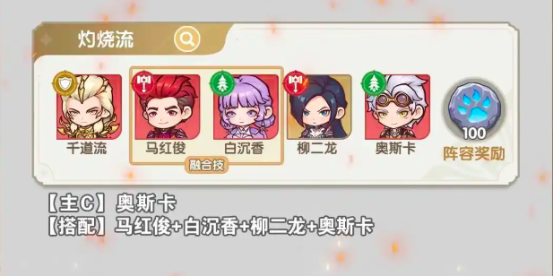 第二个流派是灼烧流,可选择千道流、马红俊、白沉香、柳二龙、奥斯卡。主c为奥斯卡,其中马红俊和白沉香能够使用出融合技能,而这一组合当中可以优先升级马红俊的凤凰啸天机与柳二龙的火龙真身,平民玩家的话,选择这个组合会有着不错的表现,真正做到低成本,高效率。