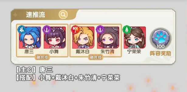 玩家在战斗过程当中也需要选择合适的队伍搭配,接下来就为大家推荐两组非常不错的选择,一个是速推流,一个是灼烧流。在速推流当中推荐唐三搭配小舞、戴沐白、朱竹清、宁荣荣。其中唐三为主控,小舞为爆发输出,戴沐白为破甲,且戴沐白搭配朱竹清可使用融合技能,而宁荣荣作为加速辅助。这个组合在主线推图和材料副本当中有着非常不错的表现,新手伙伴们可以考虑使用。