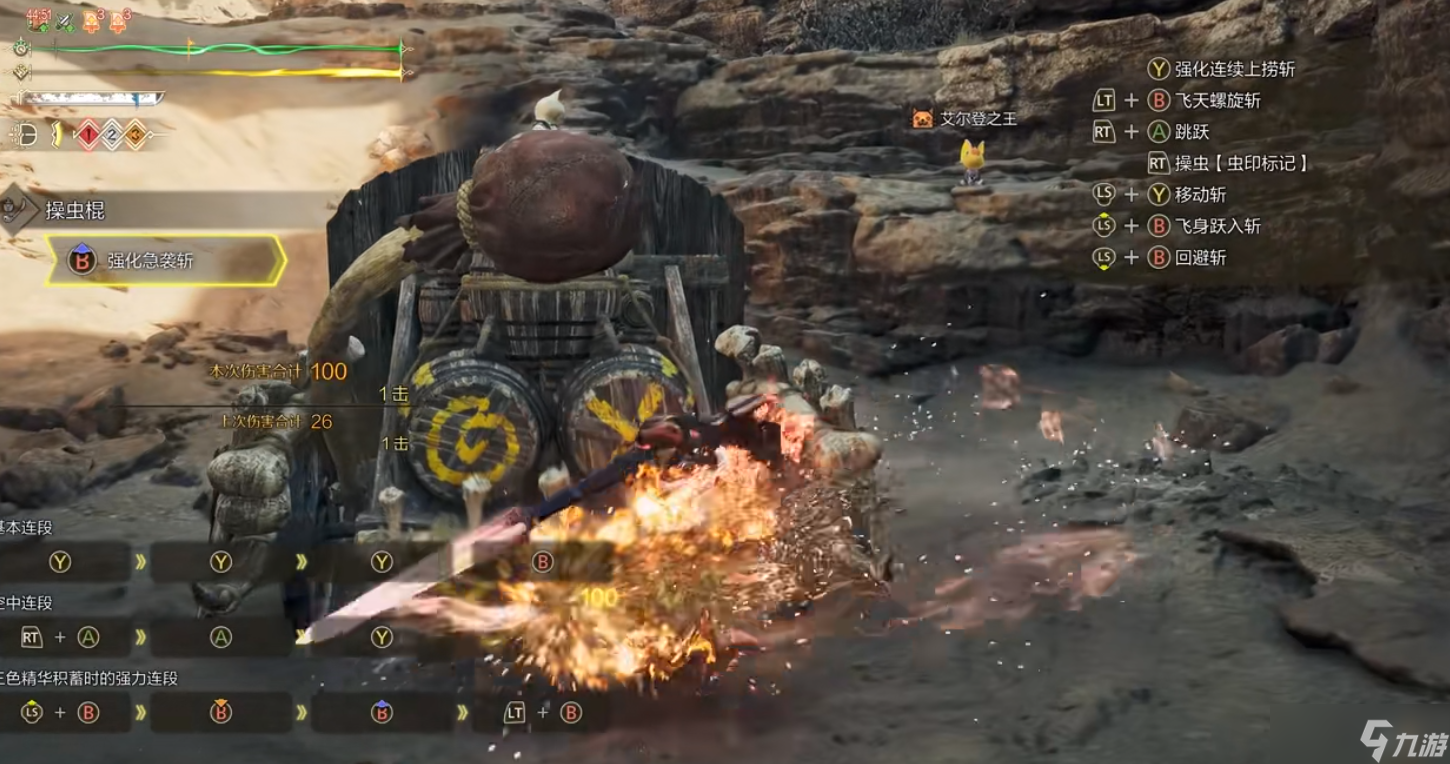终极三灯奥义: 蓄力完毕,强力的急袭斩破空而出。紧接关键操作:同时按下 LT+B 键并持续按住! 松手即意味着跃向高空,中断最强连段!只有完整施展,才能在地上打出猎虫回归的终结重击。这套连击,堪称虫棍三灯状态下的巅峰爆发!