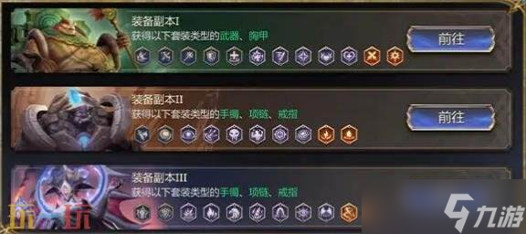 装备主要靠三大副本掉落。副本I出两件套的武器和胸甲,副本II、III出三件套的手镯、项链、戒指。难度越高,装备越好。