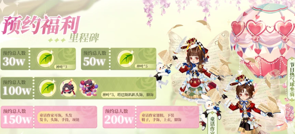 预约福利是这一次的关键,奖励力度和预约的人数会挂钩。只要完成预约,在开服的当天就能免费获取冬日暖阳套装。这一套衣服不仅好看,还会拥有收藏意义,所以千万别错过。更让人期待的是阶梯解锁奖励,预约人数达到30万全员解锁神叶三。预约人数达到50万再增加神叶3。如果预约人数达到100万可以额外的增加三个,还可以获得塔巴斯啪啪头饰以及角饰。150万就能解锁节日热气球座椅,200万可以凑齐童话作家套装全套部件,从头到脚全部都有。