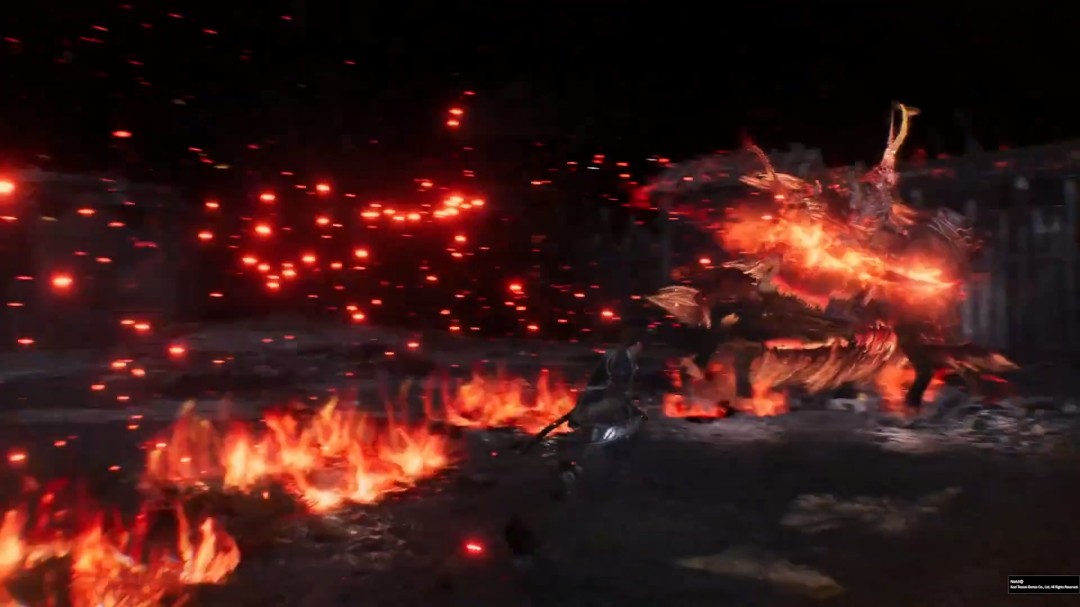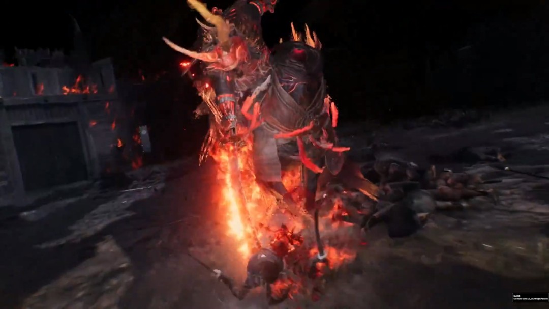 在视频中,山县昌景骑着战马手里挥舞一把长刀作战,在战斗过程中,他还会朝地面发射一连串会爆炸的火球。山县昌景会连同其战马一起化身火焰形态,武器巨型长刀散发着热焰,而战马所到之处均留下熊熊烈火。在视频最后,主角在格挡其长刀攻击后,不慎被其长刀击中,一招致死。可见,Boss战的设计还算用心,而且难度也不低。