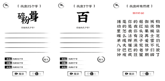 一个以汉字结构以及重组作为核心的找字游戏。每一关的题目就好像是文字谜题一样,玩家要根据提示去找出符合要求的答案。甚至可以结合日常的问答,然后去设计关卡,游戏中的道具也是比较贴心的。在体验游戏时,如果卡关也无需担心,那些提示道具,就能帮助大家理清思路,并不会因为题目的难度太高而导致大家失去兴趣。