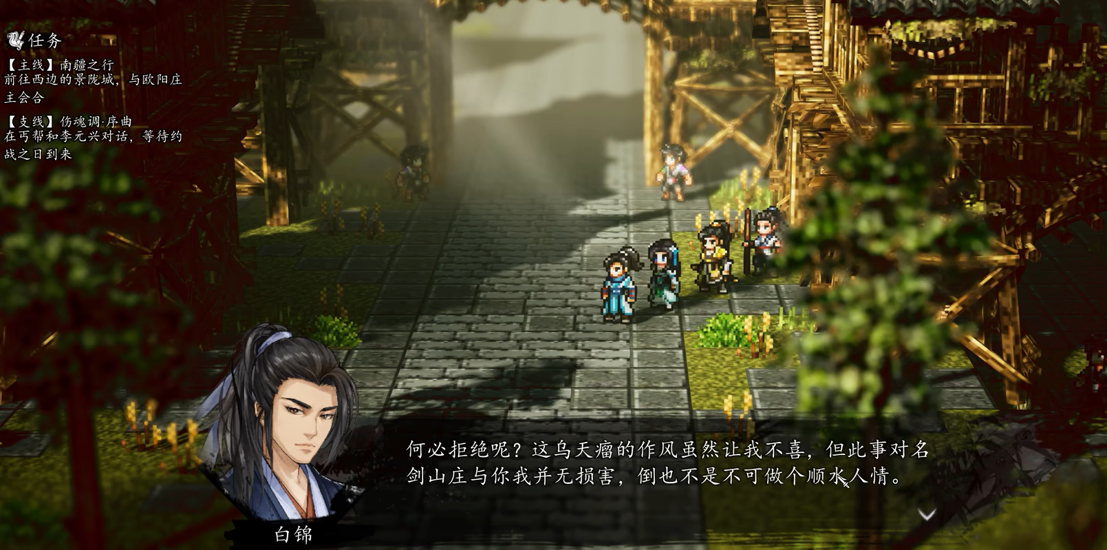 做完上面的一系列任务做完之后还有一些小支线。这个时候我们回到丐帮总舵,带上叶飞与侯九单挑可以触发隐藏剧情。去找乌天瘤接取任务,将白锦放入队伍,有着隐藏剧情,在与欧阳献公对话再回去跟乌天瘤交任务了。随后在紫竹林找到左江龙对话,之后湖区找刘玄,将吕仙儿放入队伍可以触发隐藏剧情,之后就可以回去找左江龙交任务了,可以获得一些奖励。