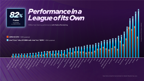 原生性能方面,搭载B390的酷睿Ultra X9 388H在45W功耗下,比53W的AMD Radeon 890M快了82%,更是碾压了高通骁龙X Elite的Adreno GPU,领先达2.6倍。