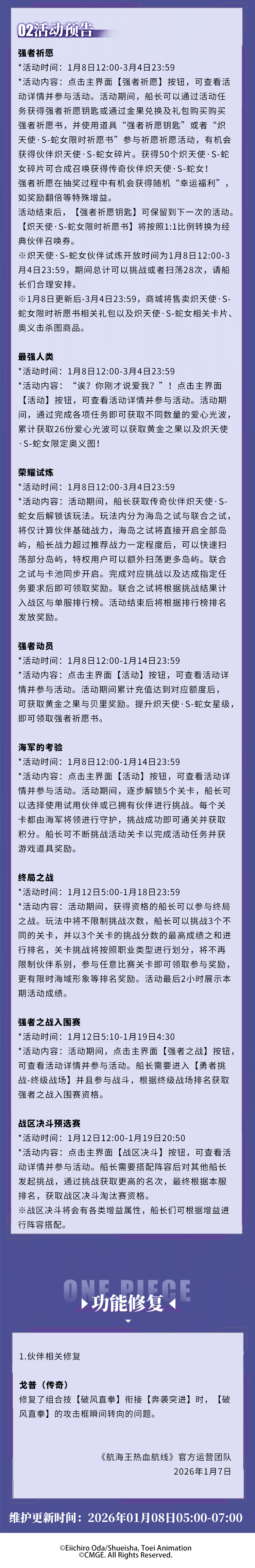 为了各位船长旅途更丰富、航行更平稳,《航海王热血航线》将于2026年1月8日5:00-7:00进行维护更新,预计停服维护2小时(可能根据实际情况提前或延后),届时将无法登录游戏,请大家互相转告并提前下线,避免不必要的损失。