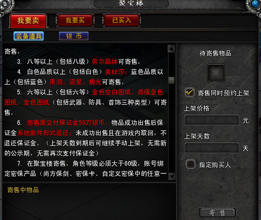 在实际操作层面,买家和卖家都需要满足一定的资格条件,且遵循固定的流程,先看买家这边,首先账号必须绑定至少一种密保措施,可选的有尚方宝剑、自定义密保、电子密保卡,这是为了确保账号的安全性,其次账号内需要创建角色,而且购买装备、道具、银币这类核心资源时,角色等级必须达到50级,这一设定主要是为了过滤新手阶段的误操作,需要注意的是,聚宝楼不支持跨服购买,玩家只能浏览和购买自己所在服务器寄售的物品。