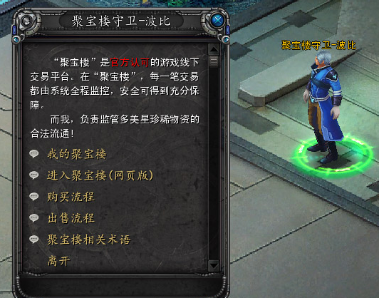 具体的购买入口有两个,一个是在游戏内找到聚宝楼守卫波比,这个NPC在三个主要场景都有固定位置,分别是太阳城、曙光前哨站和风暴城,找到后通过对话就能打开聚宝楼界面,另一个是直接登录聚宝楼网页版,登录后选择对应服务器即可浏览商品,选好要购买的物品后,用银行卡完成支付,支付成功后不需要额外操作,只要回到游戏内的聚宝楼守卫处,在我的聚宝楼里找到已买入分页,就能直接取回买到的物品,整个过程不会有延迟。