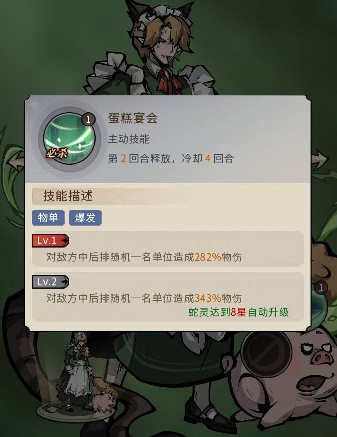 霍恩为史诗品质战士型单位,核心定位是前中期单体高爆发输出。其普攻附带特性:对敌方后排目标施放物理伤害,若目标职业为战士或法师,额外提升暴击率。必杀技“蛋糕宴会”可随机选取敌方中排或后排一名单位,造成高额物理伤害。受限于史诗品阶,仅拥有一个被动技能,最高可提供20%攻击力加成与10%生命值提升。