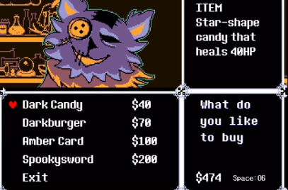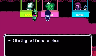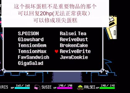 钻石巧克力:是一种角色特供的食物,不同的角色在使用之后效果会有所区别,如果是非战斗状态Kris 恢复 80HP,Susie 恢复 20HP。