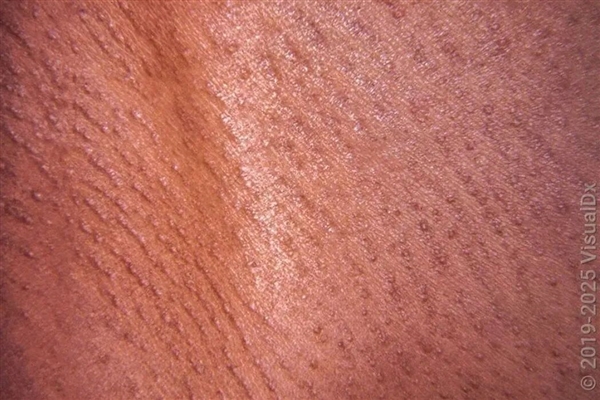这种毛囊炎的特点是,以毛囊开口区域(也就是毛囊漏斗部)为中心,出现了慢性的炎症。突出的表现是大量、密集的肤色小颗粒,只有 1、2 毫米,放大镜下看起来是“鹅皮疙瘩”。