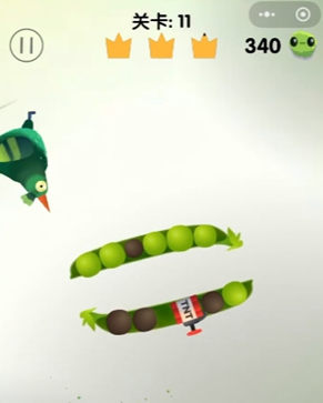 1、和之前一样开始的豌豆荚是横着放置,玩家可以先根据转动方向将左边,边边的青豆啄掉