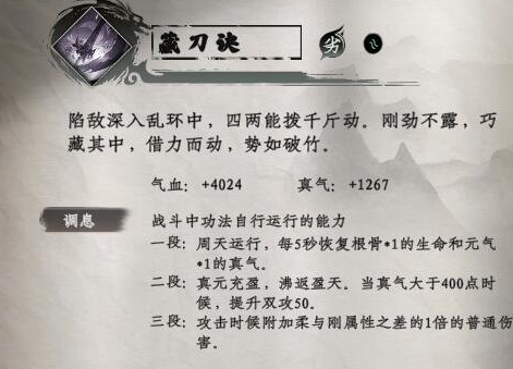 调息这就是一个被动效果,在第1个阶段时,每相隔5秒就可以恢复一个真气,还有气血。可以给角色带来足够的气血,又或者是恢复能力,有效增强续航作用。如果根骨和元气属性全部都是50,那基本上每相隔5秒就可以有效恢复50点气血。在进入到第2个阶段,如果真气超过400。可以在足够数量时就可以增强角色的攻击力,让角色在战斗的过程中始终都可以保持较好的输出强度。此时,如果发动攻击时还会有一个附加属性,使得角色在输出时效果更厉害。