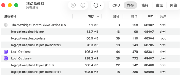 我为了录制素材刚下载 5 分钟的罗技 Options+,内存已经干到了 1G。