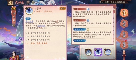 神无月每次创造幻境(用三技能),自身获得一层梦神(上限5层,每层使幻境中友方增伤18%),先机获得一层。