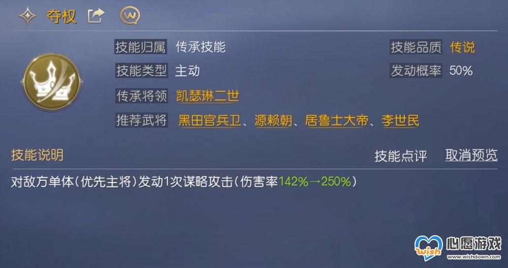 夺权来源于【凯瑟琳二世】的技能传承。因为有额外谋略加成,所以非常适合拿破仑,维多利亚女王等高谋略将领。