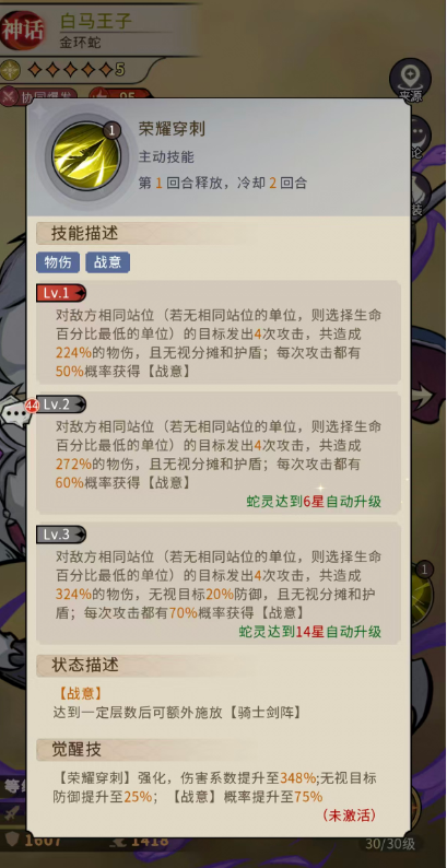 白马王子的第一个技能叫做荣耀穿刺,也是他的主动技能,在带来物伤的基础上面还有战意的加成,如果场上没有跟他一样站位的单位,此时白马王子就会选择生命百分比最低的角色作为自己的目标,一次会发出4次攻击,一起造成224%的物理伤害数值,这里是直接无视分摊和护盾能力的,且每次攻击都有50%概率获得【战意】的加成,在蛇灵达到6星自动升级如果敌方有相同站位的敌人在的话,此时同样是可以发出4次攻击,带来272%的物伤,然后无视分摊和护盾,但是这里的每次攻击都有60%的可能性可以达到更高的【战意】加成,蛇灵达到14星这里的4次攻击一起就可以造成324%的伤害数值了,且同时是可以直接无视目标20%防御,然后每次攻击都有70%概率获得【战意】,这里的【战意】层数其实非常重要,因为在这个专题太达到一定层数后可额外施放骑士剑阵的效果,觉醒强化之后的技能效果在伤害当中会提升348%的数量,然后无视目标防御提升至25%,此时最高的【战意】概率就提升到了75%。