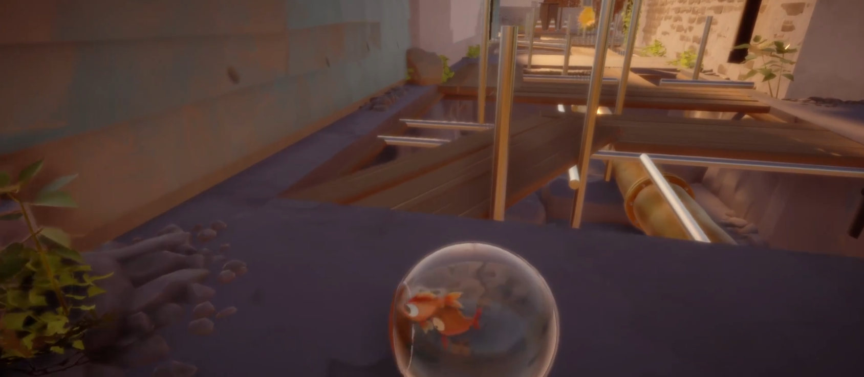 在游戏的一开始,我们会作为一条金鱼,进入到一片水塘里面,在这个池塘里面会有一个面包片,我们需要往相反的方向过去先拿到面包片,才能继续前进。拿到面包片之后,我们朝着别墅的方向游动,然后会发现一个石碓,凑齐看会看见石碓的左下方有一个洞口,我们从这个洞口进入,之后水压便会将我们给弹射到房子上方的水管里面,我们向右边游泳前进。