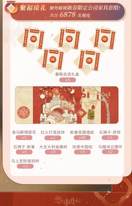 再花费22元,或一次性花费28元购买【聚福臻礼】,可额外解锁角色专属马年春联、金马献瑞窗花、石狮子等新春限定公司家具套组,共计6878美观度!