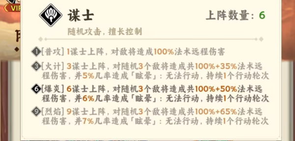 具体机制方面,谋士普通攻击造成100%法术远程伤害;当上阵3名谋士时,可对随机3名敌方单位施加135%法术伤害,并附带5%眩晕概率;6名谋士则将伤害提升至150%,眩晕概率同步增至6%;若达成9人烈焰羁绊,则伤害进一步强化至165%,眩晕率升至7%。输出与控制双重增益,形成高效压制链。