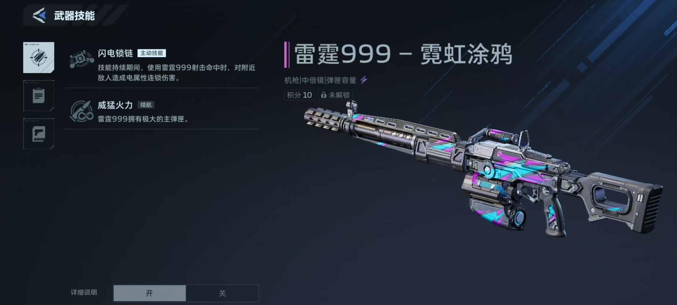 雷霆999的基础性能数据如下:单发伤害47,射速621,弱点伤害加成130%,总弹量999,精准度78,稳定度55。其核心技能“连锁闪电”可在激活期间,使每次命中触发电属性范围连锁伤害。凭借超大弹容无需频繁换弹+稳定AOE清场能力,该枪被广泛视为平民玩家PVE开荒阶段的T0级主力。后续可搭配扩容弹夹、川流不息、渐入佳境、技能扩散等插件进一步强化持续作战效能。拥有该武器后,在各类副本挑战中冲击伤害榜首位具备显著优势。
