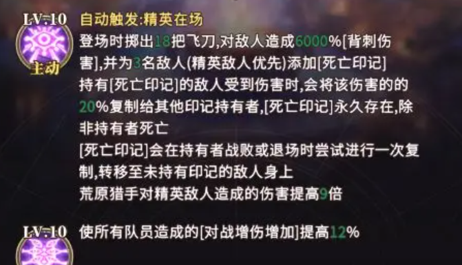 荒原猎手的主动技是自动触发的,会在登场时自动丢出18把飞刀,对敌人造成6000%背刺伤,并给3名敌人添加上死亡印记,场上有精英敌人会优先给精英添加,持有印记的敌人,在受到伤害时。