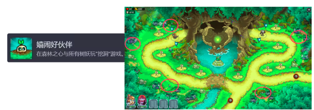 第六个成就是嬉闹好伙伴,这个成就的解锁位置,同样位于森林之心,玩家需要与所有的树林玩挖洞游戏,而这些树龄分布在5个位点上,在图片中,小编用红圈圈出来了,在左侧分布着三个,右侧分布着两个,玩家可以多点击几次就能快速完成任务。