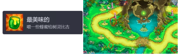 第五个成就是美味佳肴,玩家需要先前往森林之心,然后将蜂蜜给树灵比吉,树灵分别在左上角,左下角和右下角三处,之后通过多次点击就可以完成喂食任务,就能够解锁美味佳肴这一成就。