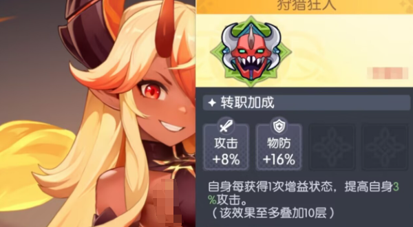 狩猎狂人:可以增加16%的攻击,还有8%的物理性防护,自己每一次获得增益状态,就能提升3%的攻击,在满层数的状态下,就可以获得30%的攻击。狩猎狂人的核心就在于增益Buff去叠加攻击,所以这一个攻击加成还是比较可观的,但有一个大前提,那就是射手可以迅速的获取增益状态。有些角色叠加的速度太慢,想要叠加10层,那真的是难如登天,还是不要白白浪费时间。