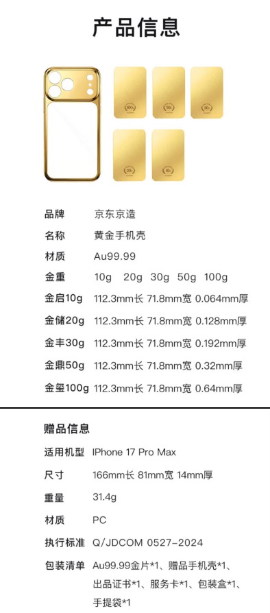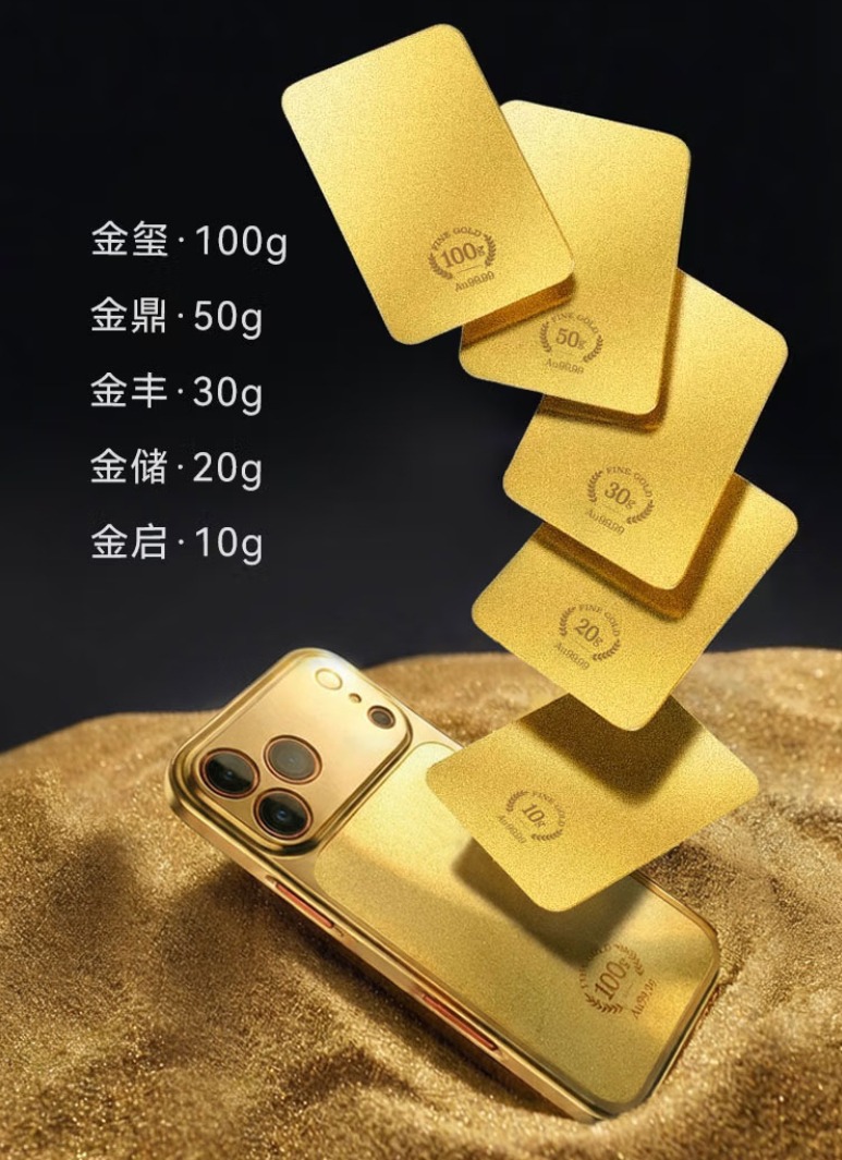 这款产品并非整体纯金打造,而是由PC材质手机壳与Au99.99足金金片两部分组成,背部金片支持自由选择,提供五种克重规格及对应价格:10g(金启)11299元、20g(金储)22499元、30g(金丰)33699元、50g(金鼎)56199元、100g(金玺)112299元。