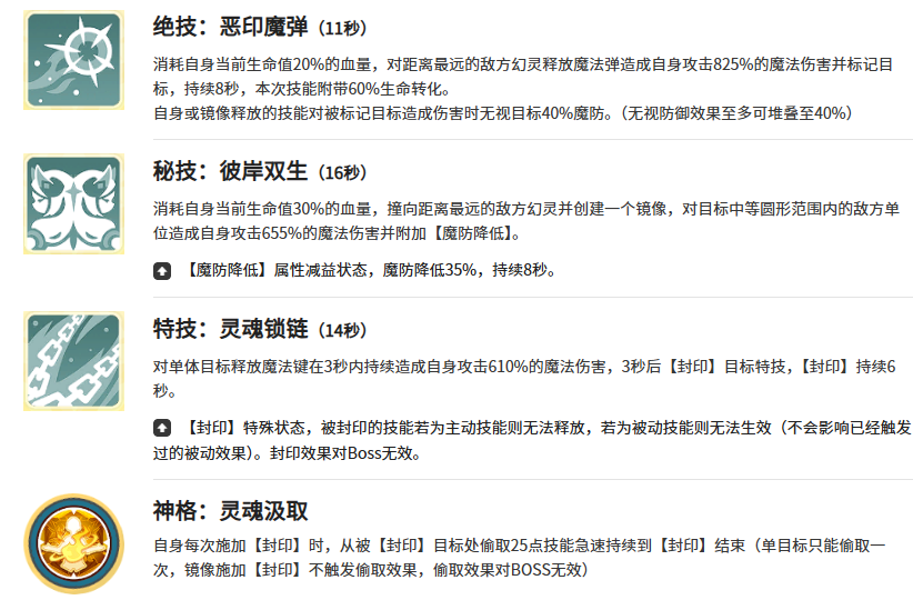技能体系围绕“血量管理—魔抗削弱—行动干扰”三层逻辑构建:绝技为消耗当前生命值触发的远程范围伤害;秘技可对目标施加撞击效果并降低其魔法抗性;特技则通过链条封印强制禁用敌方主动技能。三者均具备明确的功能指向性,强调团队协作价值,尤其适配刺客与法师双核阵容。