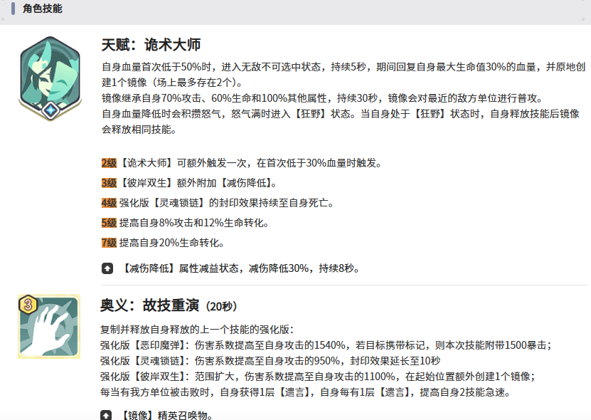 天赋机制突出生存反制特性:当生命值低于一定阈值时,自动召唤镜像分身,并获得短暂无敌状态。该效果不仅提升容错率,更可配合奥义实现技能多段释放,形成连续压制链,在关键战斗节点中具备决定性翻盘潜力。