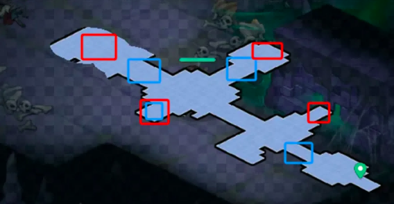 在图片当中小编用红蓝两种方块进行了划分,蓝色标识的地方,一般都是无怪兽出没,可直接拿到的宝箱。而红色方块都是需要玩家与boss战斗的位点。整体来看地图模式较为简单,而且在宝箱分布上,也是较为均匀的,大体按照直线前行即可,在左右两侧的小耳室里,能够拿到不少的宝物,但要注意拾取左右两侧岔路尽头的宝箱,难度系数可能会偏高。