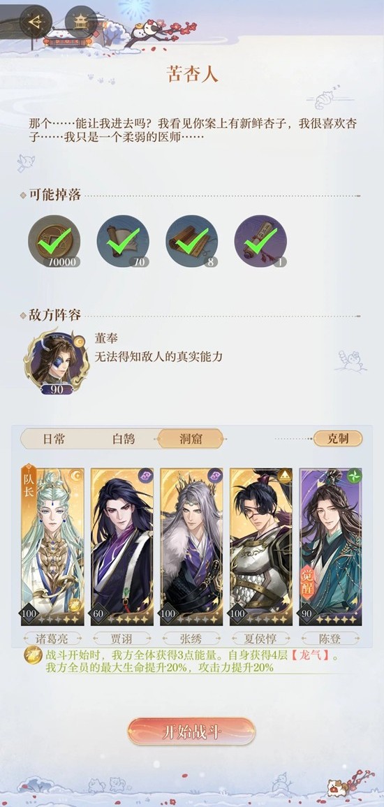 结语:以上是心愿游戏小编为您收集的如鸢1月神秘洞窟 一星张绣孤骨磨6回合通关攻略,希望能帮助到大家,更多相关的文章请关注心愿游戏。