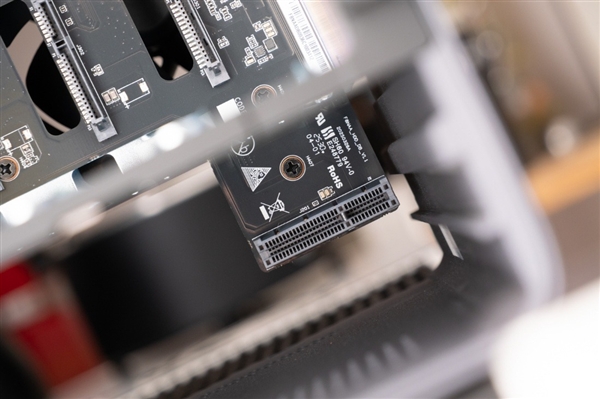 底部固定螺丝拆卸后可以直接抽出整套主板架,模块化程度很高,维护和升级都非常直观。从主板布局看,CPU一侧集成了PCIe插槽和内存槽,另一侧为M.2 SSD区域,并额外配备了SSD散热风扇。