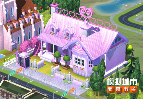 《模拟城市:我是市长》所推出的恋爱小屋,是一栋以粉色为主要色调的西式小别墅。该建筑不仅在墙体与屋檐处大面积运用了明艳的粉色,还在屋顶和庭院里增添了不少带有爱心元素的装饰品,进而营造出浓郁的恋爱氛围。