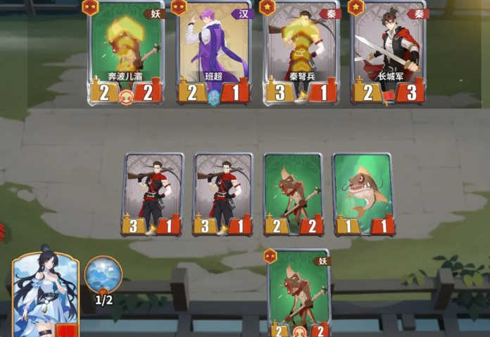 而这个时候的西施已经拿到三张核心卡牌的话,其实可以拿到的胜利概率相比其他的同时期武将而言是更大一些的,当然如果在完成西施的各种套路搭配之后,大家要注意她在第三个回合里面更适合去搭配奔波儿灞,奔波儿灞在当前作为一个基础的卡牌前期赶紧拿,后面在普通回合里面拿到的卡大家也要注意星级,第一个回合拿一星卡的话也是留在手中,第二个回合有两张相同一星卡的话就可以用起来,如果商店当中建议大家是选择同样的两张卡,如果没有的话,留一张就可以了,第三个回合里面,然后店里面只要刷出了奔波儿灞,那么大家就可以拿到前期的更多优势。