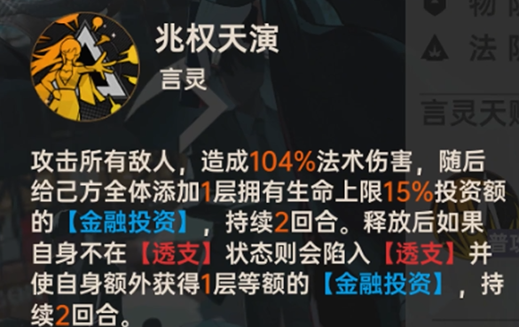 说到她的强力技能“兆权天演”,更是让人眼前一亮。苏恩曦发动这个技能时,不仅能对敌人造成全体法术伤害,还能为队友增加“金融投资”状态。在她不处于“透支”状态时,这个技能的效果就会更强。金融投资状态下的队友,可以吸收一定伤害,进一步提升整个团队的生存能力。而每次敌人对她的攻击,都有可能让苏恩曦再次为全体队友添加金融投资,形成一种持续的防护循环。