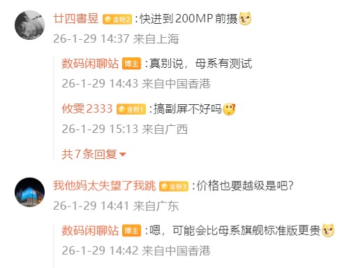 网友们的讨论还延伸到其他配置细节。有网友调侃“快进到200MP前摄”,没想到博主回应“母系有测试”,暗示前摄高像素化也可能提上日程。对于副屏需求,有网友疑问“搞副屏不好吗”,表达了对功能性配置的偏好。而超广角镜头的配置则成为争议点,有网友怒怼现有低像素超广角,博主则安慰“不是8mp就算成功”,侧面透露新机型超广角可能会有基础规格保障。