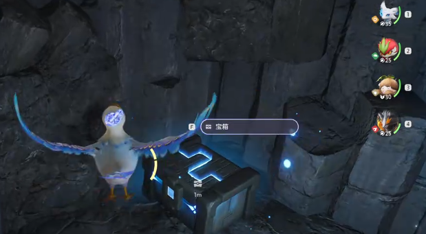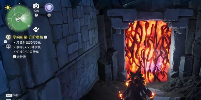 这扇门前面是有很多荆棘给门口挡住的,所以大家在这里直接使用小炭犬的技能效果,燃烧掉这里的荆棘,就可以进入其中,然后有一个能量收集需要大家做完,跟随亮起来的蓝色球型能量体就可以完成能量收集,随后开始探索大家首先遇到的会是碎岩仔,这里大家还可以收集到很多的土灵碎晶,其中有些宝箱的位置比较隐蔽,大家可能需要依靠不同的路线探索才可以进入其中,还有部分宝箱是藏在没有光照的石壁处,此类宝箱周边有一些蓝色的光晕特效会显露,大家可以依靠这些特效来找到宝箱。