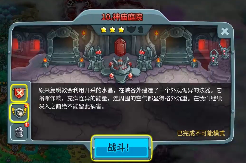 神庙庭院共有四个出怪口,左边两个和上边两个,它们会在中间进行交汇,同时玩家也需要守三个门,右边两个和下边一个,因而本关敌人的行进路线为从左至右和从上至下,所以玩家们在布置防线时,重心可以放在中间交汇处,确保防御塔的伤害能打到尽可能多地敌人。此外,在开始挑战前,各位点击关卡右上方的雕像,从左至右分别将雕像摆成双手朝上打开、双手在头上摆出爱心,双手朝左摆出爱心和双手朝上闭合这四种状态,完成后只需等上2秒,就会触发雕像彩蛋,出现4个帮手来协助玩家守关。
