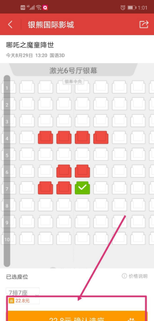 6.点击【特惠】,选择座位,选择好了,下面会显示,看到【22.8元 确认选座】,如下图