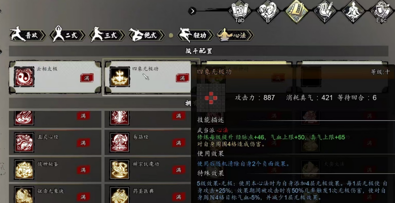 四象无极功作为武当门派的代表心法,获得方式并不复杂,只需要通过门派请教便能习得。这项心法的核心优势就在于它强大的范围伤害以及对负面效果的清除能力。使用四象无极功后,能够对周围四格内的敌人造成伤害,同时有机会清除自身的两个负面效果,这让它在多种战斗场景中表现得尤为灵活。而当这项心法升至5级时,还能触发无极效果,使自身的攻击力得到大幅提升。每一层无极效果都能增加25%的攻击力,最多叠加四层,这意味着满层之后,攻击力可以提升高达100%,让你瞬间化身输出怪兽。